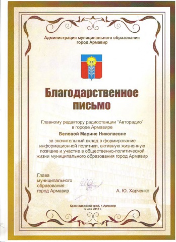 Благодарственное письмо главному редактору радиостанции "Авторадио"